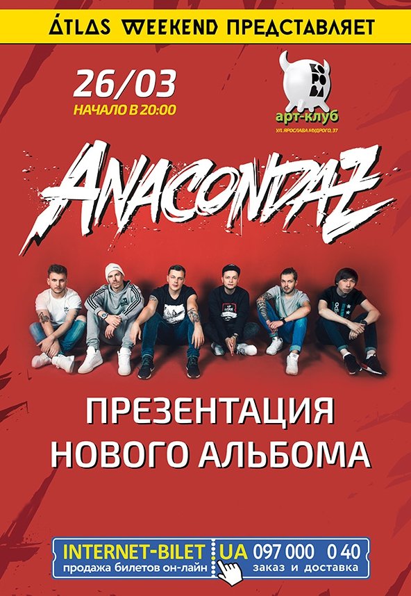 ANACONDAZ состоится 26 марта 2017, 20:00, воскресенье в Клуб "Корова". С помощью сервиса internet-bilet.ua, Вы сможете с легкостью забронировать, заказать и купить билеты на интересующий Вас концерт, спектакль, оперу, балет, мастер-классы, спортивные и детские мероприятия, оплатив их самым удобным для Вас способом: через интернет банковской картой VISA/MasterCard, наличными или курьером, если сделаете заказ билета c доставкой.