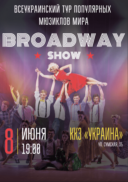 Broadway Show состоится 8 июня 2016, 19:00, среда в ККЗ "Україна". С помощью сервиса internet-bilet.ua, Вы сможете с легкостью забронировать, заказать и купить билеты на интересующий Вас концерт, спектакль, оперу, балет, мастер-классы, спортивные и детские мероприятия, оплатив их самым удобным для Вас способом: через интернет банковской картой VISA/MasterCard, наличными или курьером, если сделаете заказ билета c доставкой.