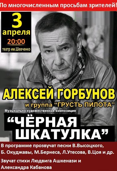 Алексей Горбунов и группа «Грусть Пилота» в музыкальном спектакле «Черная Шкатулка». Большая премьера, проходящая с аншлагами в городах Украины, а 3 апреля 2018 года, по многочисленным просьбам, спектакль смогут увидеть жители Харькова. Маленькие рассказы о любви, о войне, о женщине, о детях, и, конечно, о надежде, по мотивам произведений Людвика Ашкенази. Такие родные памяти старые песни, которые много лет назад звучали с каждого двора. Высоцкий, Бернес, Окуджава — музыка, которая касается струн души.