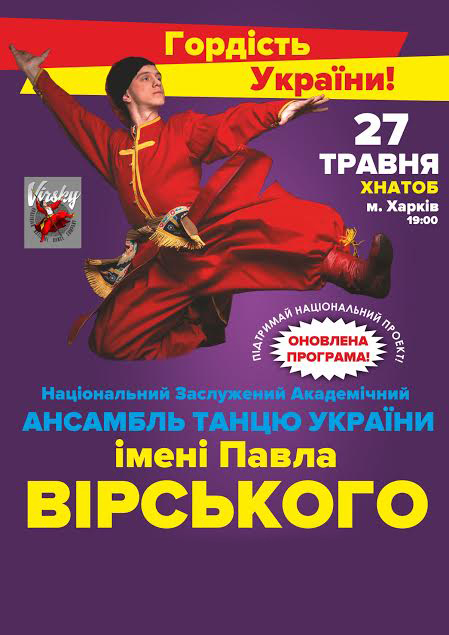 Ансамбль танцю ім. Павла Вірського состоится 27 мая 2016, 19:00, пятница в ХНАТОБ. С помощью сервиса internet-bilet.ua, Вы сможете с легкостью забронировать, заказать и купить билеты на интересующий Вас концерт, спектакль, оперу, балет, мастер-классы, спортивные и детские мероприятия, оплатив их самым удобным для Вас способом: через интернет банковской картой VISA/MasterCard, наличными или курьером, если сделаете заказ билета c доставкой.