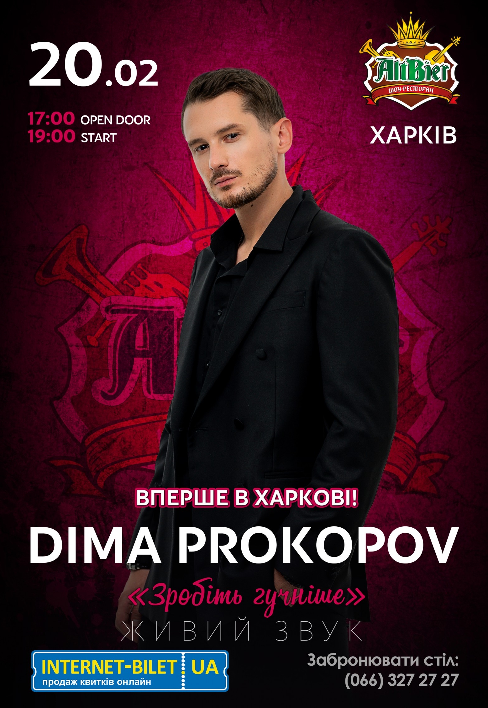 Dima Prokopov состоится 20 февраля 2026, 19:00, пятница в Шоу-ресторан «AltBier». С помощью сервиса internet-bilet.ua, Вы сможете с легкостью забронировать, заказать и купить билеты на интересующий Вас концерт, спектакль, оперу, балет, мастер-классы, спортивные и детские мероприятия, оплатив их самым удобным для Вас способом: через интернет банковской картой VISA/MasterCard, наличными или курьером, если сделаете заказ билета c доставкой.