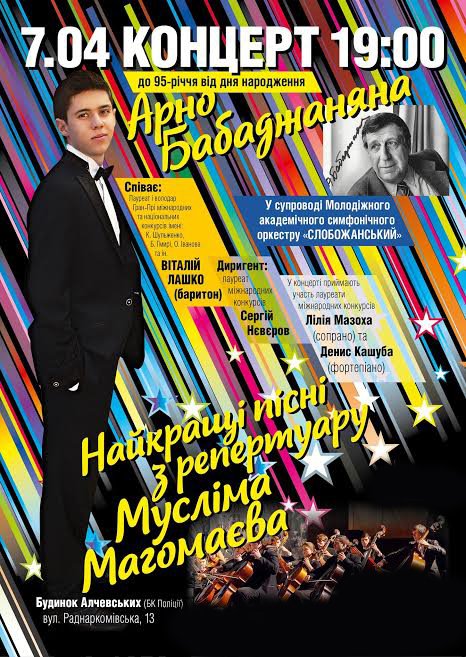Концерт к 95-летию со Дня рождения Арно Бабаджаняна состоится 7 апреля 2016, 19:00, четверг в ДК Милиции (Дом Алчевских). С помощью сервиса internet-bilet.ua, Вы сможете с легкостью забронировать, заказать и купить билеты на интересующий Вас концерт, спектакль, оперу, балет, мастер-классы, спортивные и детские мероприятия, оплатив их самым удобным для Вас способом: через интернет банковской картой VISA/MasterCard, наличными или курьером, если сделаете заказ билета c доставкой.