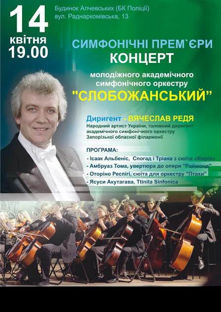 Симфонические премьеры с Вячеславом Редей состоится 14 апреля 2016, 19:00, четверг в ДК Милиции (Дом Алчевских). С помощью сервиса internet-bilet.ua, Вы сможете с легкостью забронировать, заказать и купить билеты на интересующий Вас концерт, спектакль, оперу, балет, мастер-классы, спортивные и детские мероприятия, оплатив их самым удобным для Вас способом: через интернет банковской картой VISA/MasterCard, наличными или курьером, если сделаете заказ билета c доставкой.