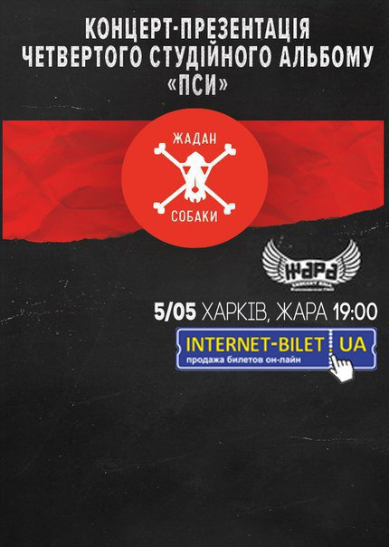 Жадан і собаки. Презентація альбому ПСИ. состоится 5 мая 2016, 19:00, четверг в Клуб "Жара". С помощью сервиса internet-bilet.ua, Вы сможете с легкостью забронировать, заказать и купить билеты на интересующий Вас концерт, спектакль, оперу, балет, мастер-классы, спортивные и детские мероприятия, оплатив их самым удобным для Вас способом: через интернет банковской картой VISA/MasterCard, наличными или курьером, если сделаете заказ билета c доставкой.