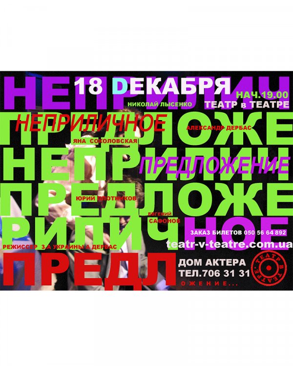 "Театр в театре". Неприличное предложение состоится 18 декабря 2012, 19:00, вторник в Дом Актера. С помощью сервиса internet-bilet.ua, Вы сможете с легкостью забронировать, заказать и купить билеты на интересующий Вас концерт, спектакль, оперу, балет, мастер-классы, спортивные и детские мероприятия, оплатив их самым удобным для Вас способом: через интернет банковской картой VISA/MasterCard, наличными или курьером, если сделаете заказ билета c доставкой.