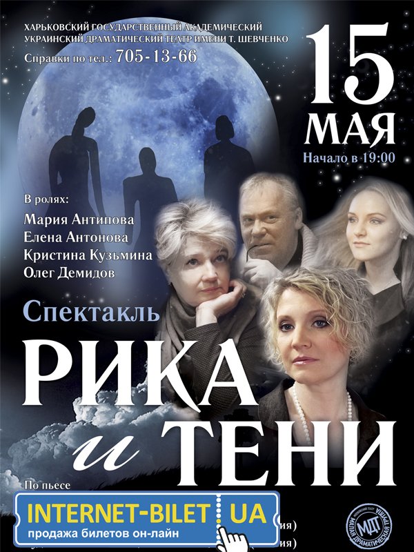 Рика и тени состоится 15 мая 2013, 19:00, среда в Харьковский театр им. Т.Г. Шевченко. С помощью сервиса internet-bilet.ua, Вы сможете с легкостью забронировать, заказать и купить билеты на интересующий Вас концерт, спектакль, оперу, балет, мастер-классы, спортивные и детские мероприятия, оплатив их самым удобным для Вас способом: через интернет банковской картой VISA/MasterCard, наличными или курьером, если сделаете заказ билета c доставкой.