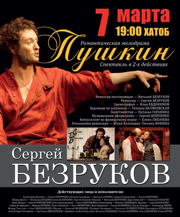 Театр Сергея Безрукова представляет свой взгляд на жизнь и судьбу Александра Сергеевича Пушкина.
