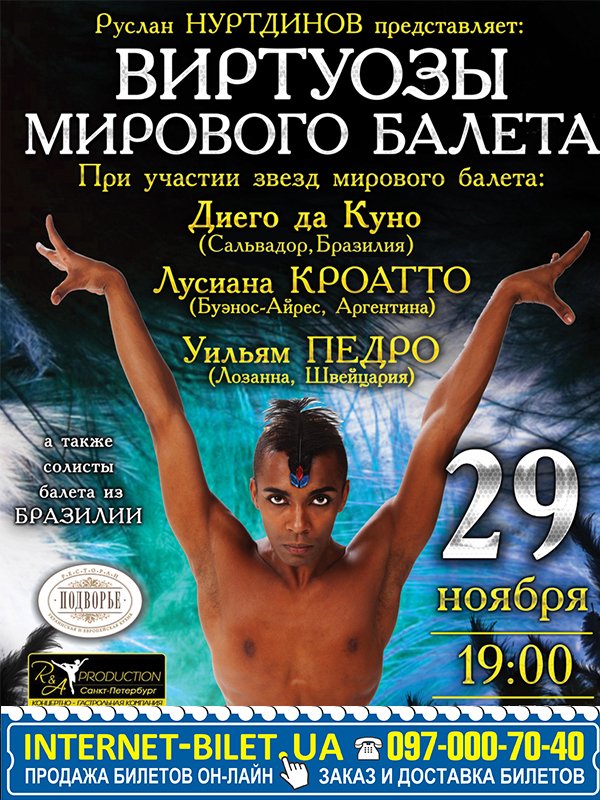Виртуозы мирового балета состоится 29 ноября 2013, 19:00, пятница в ХНАТОБ. С помощью сервиса internet-bilet.ua, Вы сможете с легкостью забронировать, заказать и купить билеты на интересующий Вас концерт, спектакль, оперу, балет, мастер-классы, спортивные и детские мероприятия, оплатив их самым удобным для Вас способом: через интернет банковской картой VISA/MasterCard, наличными или курьером, если сделаете заказ билета c доставкой.