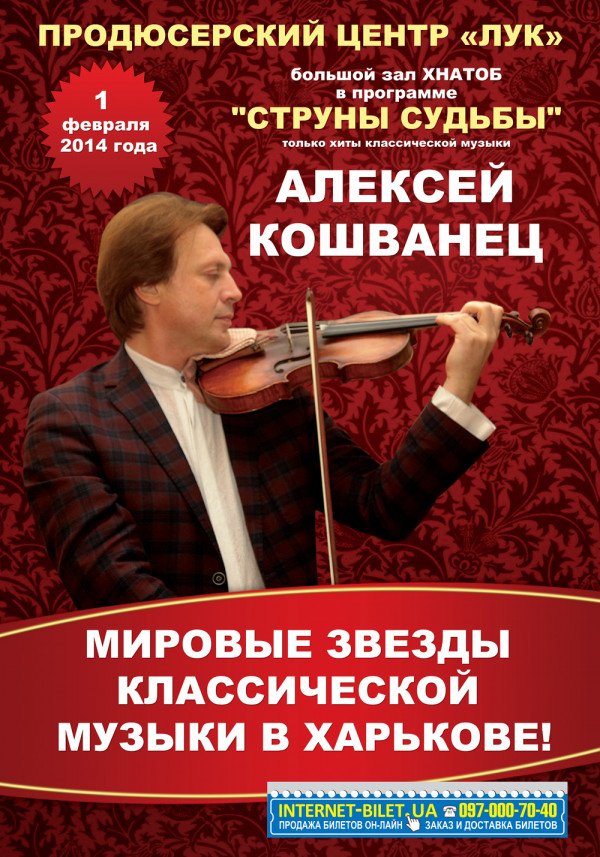 СТРУНЫ СУДЬБЫ состоится 1 февраля 2014, 19:00, суббота в ХНАТОБ. С помощью сервиса internet-bilet.ua, Вы сможете с легкостью забронировать, заказать и купить билеты на интересующий Вас концерт, спектакль, оперу, балет, мастер-классы, спортивные и детские мероприятия, оплатив их самым удобным для Вас способом: через интернет банковской картой VISA/MasterCard, наличными или курьером, если сделаете заказ билета c доставкой.