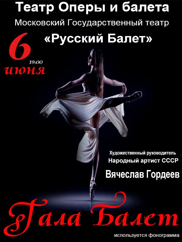 МОСКОВСКИЙ ГОСУДАРСТВЕННЫЙ ТЕАТР «РУССКИЙ БАЛЕТ»Под управлением Народного артиста СССР, звезды мирового балета Вячеслава Гордеева.Театр "Русский Балет" под руководством Вячеслава Гордеева показывает балет высочайшего качества, за годы руководства театром “Русский балет” В. М. Гордеев поставил более 30 концертных номеров и хореографических композиций, которые по праву можно назвать спектаклями-шедевры!!!!Театр “Русский балет” выступает пропагандистом русского классического наследия на высоком художественном уровне в России и за рубежом, приобщая к искусству прекрасного весь мир. Гастроли Московского Государственного театра "Русский балет" приурочены к 65 летнему юбилею со дня рождения и 50 летнему юбилею творческой деятельности Вячеслава Михайловича Гордеева. За годы творческой карьеры В. Гордеев создал незабываемые хореографические образы. Виртуозное исполнительское мастерство и яркая индивидуальность снискали профессиональное признание и любовь публики. Спектакли поставленные В. Гордеевым, с успехом идут на ведущих мировых сценических площадках. Гастрольные маршруты на карте мира пролегли с севера на юг, с востока на запад, пересекли Гринвичский меридиан и экватор-США, Мексика, Западная Европа, Австралия, Индия, Непал, Индонезия, Страны Персидского залива: Многие государства ждут и встречают артистов ежегодно.Спектакль состоит из жемчужин классики и современных постановок Народного артиста России В .Гордеева. В это вечер вы увидите виртуозное мастерство артистов, лучшие шедевры В. Гордеева удивят поклонников балетного искусства. Спектакль состоит из балетов «Щелкунчик», «Дон Кихот», «Лебединое озеро», «Конек Горбунок», «Барышня и хулиган», потрясающая хореографическая поэма цыганка из балета «Мариула», предельно раскрывшее выразительные возможности танцовщика - гопак из балета Тарас Бульба.