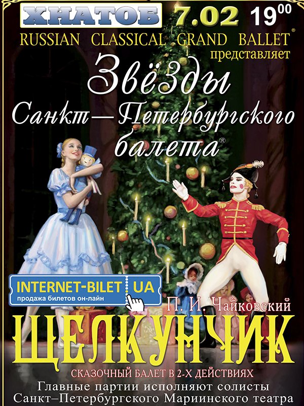 Щелкунчик состоится 7 февраля 2014, 19:00, пятница в ХНАТОБ. С помощью сервиса internet-bilet.ua, Вы сможете с легкостью забронировать, заказать и купить билеты на интересующий Вас концерт, спектакль, оперу, балет, мастер-классы, спортивные и детские мероприятия, оплатив их самым удобным для Вас способом: через интернет банковской картой VISA/MasterCard, наличными или курьером, если сделаете заказ билета c доставкой.