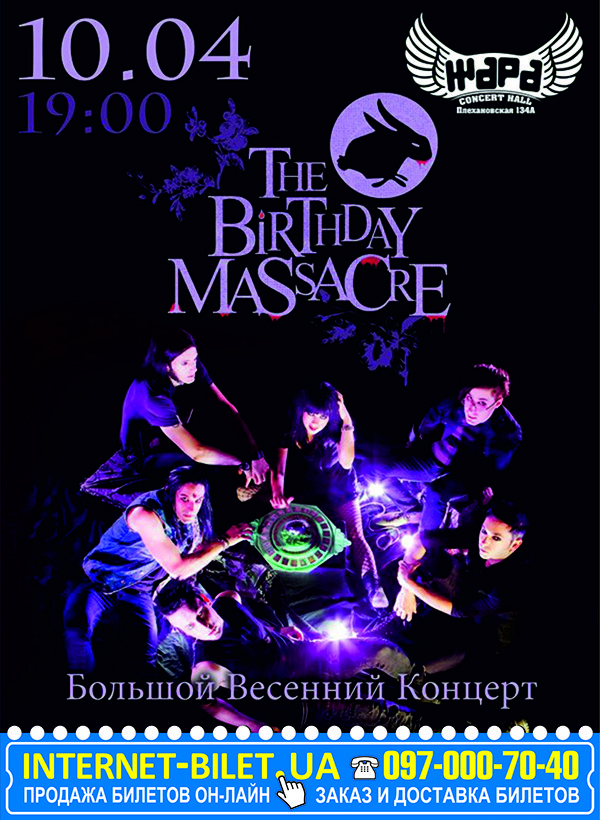 The Birthday Massacre состоится 10 апреля 2014, 19:00, четверг в Клуб "Жара". С помощью сервиса internet-bilet.ua, Вы сможете с легкостью забронировать, заказать и купить билеты на интересующий Вас концерт, спектакль, оперу, балет, мастер-классы, спортивные и детские мероприятия, оплатив их самым удобным для Вас способом: через интернет банковской картой VISA/MasterCard, наличными или курьером, если сделаете заказ билета c доставкой.