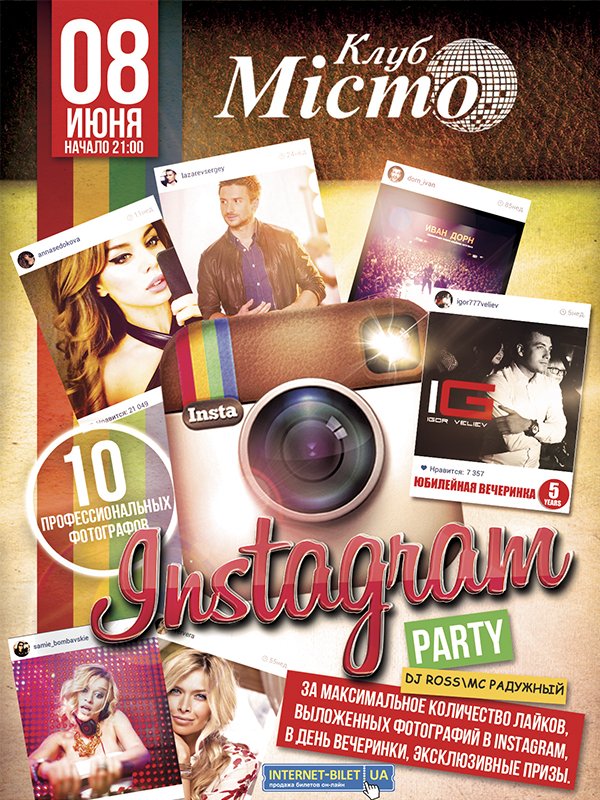 Вечеринка "Instagram party" состоится 8 июня 2014, 21:00, воскресенье в Клуб Місто. С помощью сервиса internet-bilet.ua, Вы сможете с легкостью забронировать, заказать и купить билеты на интересующий Вас концерт, спектакль, оперу, балет, мастер-классы, спортивные и детские мероприятия, оплатив их самым удобным для Вас способом: через интернет банковской картой VISA/MasterCard, наличными или курьером, если сделаете заказ билета c доставкой.