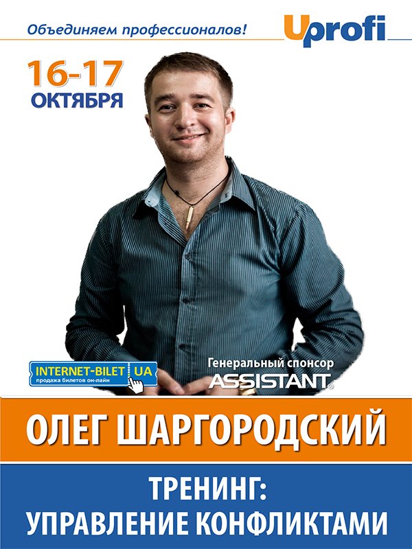 Тренинг Олега Шаргородского. «Управление конфликтами» состоится 16 октября 2014, 10:00, четверг в Зал компании "4Profi". С помощью сервиса internet-bilet.ua, Вы сможете с легкостью забронировать, заказать и купить билеты на интересующий Вас концерт, спектакль, оперу, балет, мастер-классы, спортивные и детские мероприятия, оплатив их самым удобным для Вас способом: через интернет банковской картой VISA/MasterCard, наличными или курьером, если сделаете заказ билета c доставкой.
