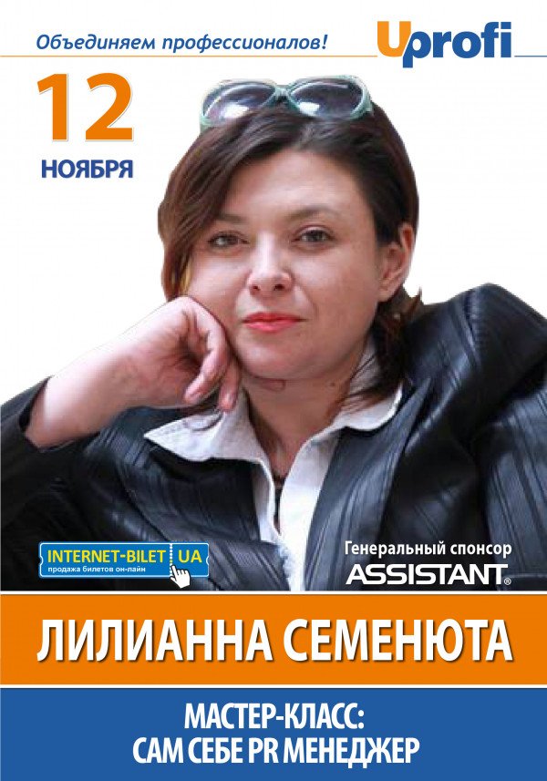 Мастер-класс Лилианны Семенюты "Сам себе PR менеджер" состоится 12 ноября 2014, 17:00, среда в Зал компании "4Profi". С помощью сервиса internet-bilet.ua, Вы сможете с легкостью забронировать, заказать и купить билеты на интересующий Вас концерт, спектакль, оперу, балет, мастер-классы, спортивные и детские мероприятия, оплатив их самым удобным для Вас способом: через интернет банковской картой VISA/MasterCard, наличными или курьером, если сделаете заказ билета c доставкой.