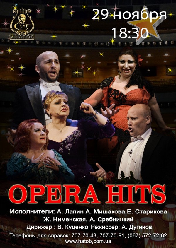 КОНЦЕРТ "OPERA HITS" состоится 29 ноября 2014, 18:30, суббота в ХНАТОБ. С помощью сервиса internet-bilet.ua, Вы сможете с легкостью забронировать, заказать и купить билеты на интересующий Вас концерт, спектакль, оперу, балет, мастер-классы, спортивные и детские мероприятия, оплатив их самым удобным для Вас способом: через интернет банковской картой VISA/MasterCard, наличными или курьером, если сделаете заказ билета c доставкой.