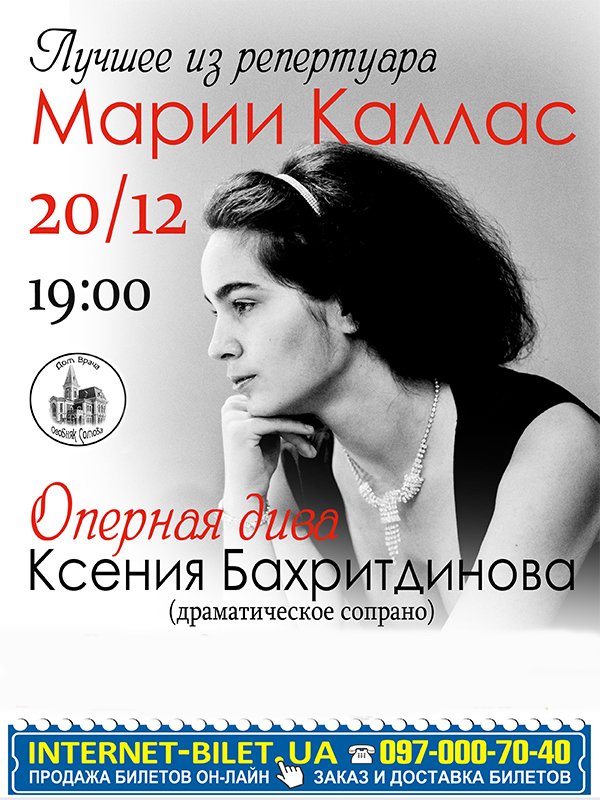 Ксения Бахритдинова "Лучшее из Марии Каллас" состоится 20 декабря 2014, 19:00, суббота в Особняк Сомова(бывший). С помощью сервиса internet-bilet.ua, Вы сможете с легкостью забронировать, заказать и купить билеты на интересующий Вас концерт, спектакль, оперу, балет, мастер-классы, спортивные и детские мероприятия, оплатив их самым удобным для Вас способом: через интернет банковской картой VISA/MasterCard, наличными или курьером, если сделаете заказ билета c доставкой.