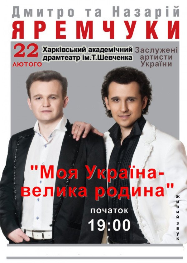 Дмитро та Назарій Яремчуки состоится 22 февраля 2015, 19:00, воскресенье в Харьковский театр им. Т.Г. Шевченко. С помощью сервиса internet-bilet.ua, Вы сможете с легкостью забронировать, заказать и купить билеты на интересующий Вас концерт, спектакль, оперу, балет, мастер-классы, спортивные и детские мероприятия, оплатив их самым удобным для Вас способом: через интернет банковской картой VISA/MasterCard, наличными или курьером, если сделаете заказ билета c доставкой.