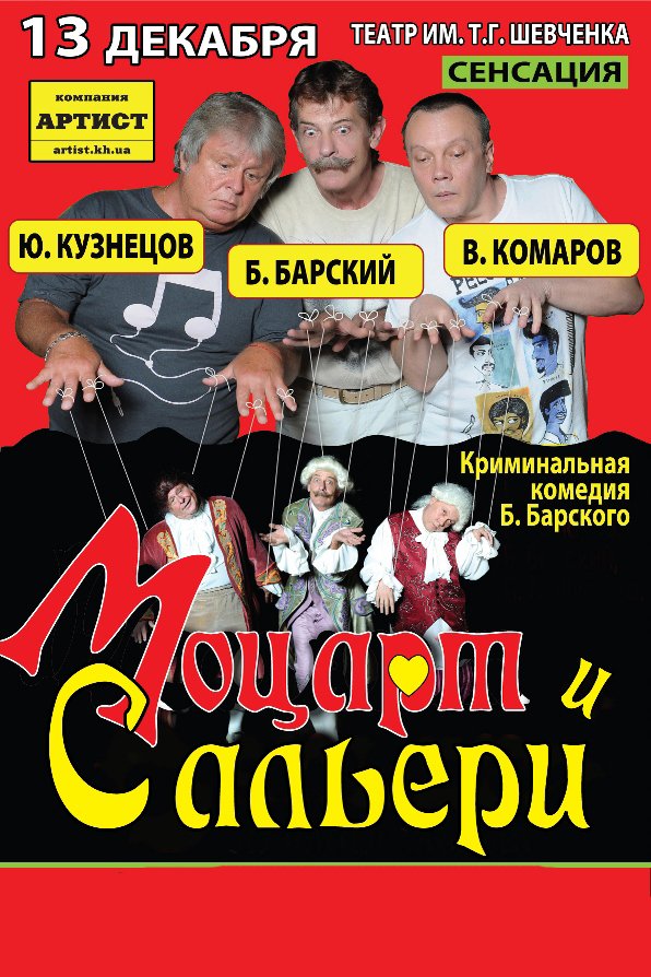 КОМЕДИЯ "МОЦАРТ И САЛЬЕРИ" состоится 13 декабря 2015, 19:00, воскресенье в Харьковский театр им. Т.Г. Шевченко. С помощью сервиса internet-bilet.ua, Вы сможете с легкостью забронировать, заказать и купить билеты на интересующий Вас концерт, спектакль, оперу, балет, мастер-классы, спортивные и детские мероприятия, оплатив их самым удобным для Вас способом: через интернет банковской картой VISA/MasterCard, наличными или курьером, если сделаете заказ билета c доставкой.