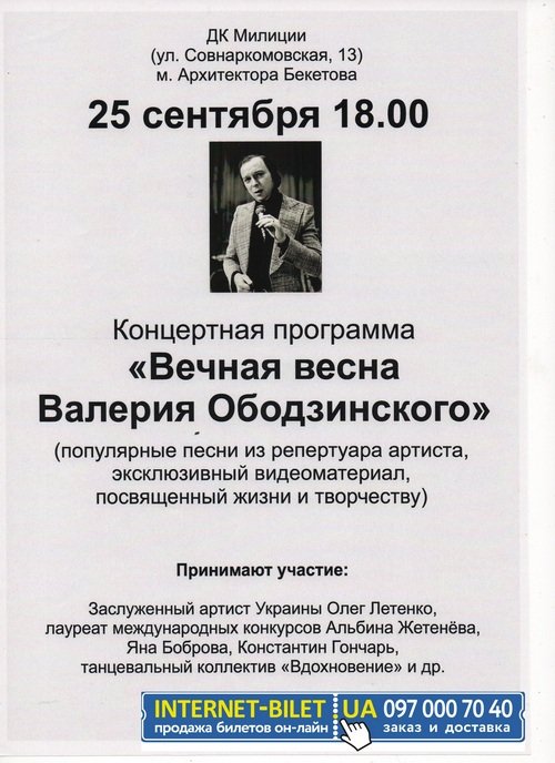 Вечная весна Валерия Ободзинского состоится 23 ноября 2015, 18:00, понедельник в ДК Милиции (Дом Алчевских). С помощью сервиса internet-bilet.ua, Вы сможете с легкостью забронировать, заказать и купить билеты на интересующий Вас концерт, спектакль, оперу, балет, мастер-классы, спортивные и детские мероприятия, оплатив их самым удобным для Вас способом: через интернет банковской картой VISA/MasterCard, наличными или курьером, если сделаете заказ билета c доставкой.
