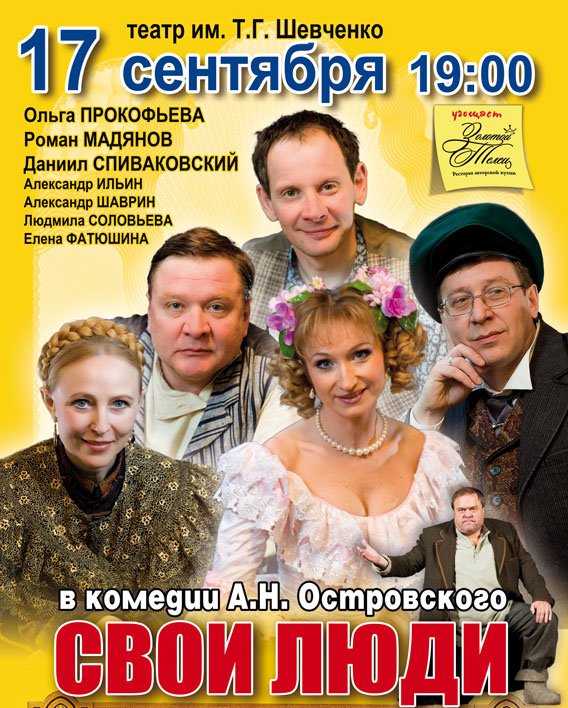 Вам предоставляется уникальная возможность оценить премьеру лучшей комедии театрального сезона - спектакль «Свои люди» по пьесе Александра Островского в новом оформлении, с потрясающими костюмами, великолепными декорациями, в исполнении звёзд Московского театра