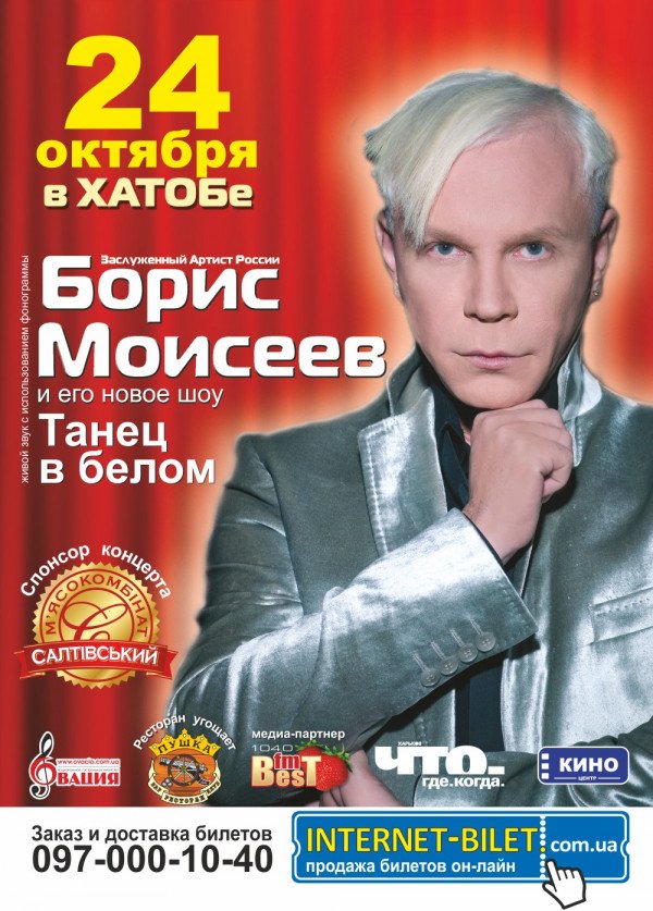 Борис Моисеев состоится 24 октября 2011, 19:00, понедельник в ХНАТОБ. С помощью сервиса internet-bilet.ua, Вы сможете с легкостью забронировать, заказать и купить билеты на интересующий Вас концерт, спектакль, оперу, балет, мастер-классы, спортивные и детские мероприятия, оплатив их самым удобным для Вас способом: через интернет банковской картой VISA/MasterCard, наличными или курьером, если сделаете заказ билета c доставкой.