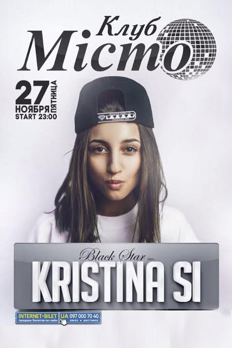 Kristina Si состоится 27 ноября 2015, 23:00, пятница в Клуб Місто. С помощью сервиса internet-bilet.ua, Вы сможете с легкостью забронировать, заказать и купить билеты на интересующий Вас концерт, спектакль, оперу, балет, мастер-классы, спортивные и детские мероприятия, оплатив их самым удобным для Вас способом: через интернет банковской картой VISA/MasterCard, наличными или курьером, если сделаете заказ билета c доставкой.