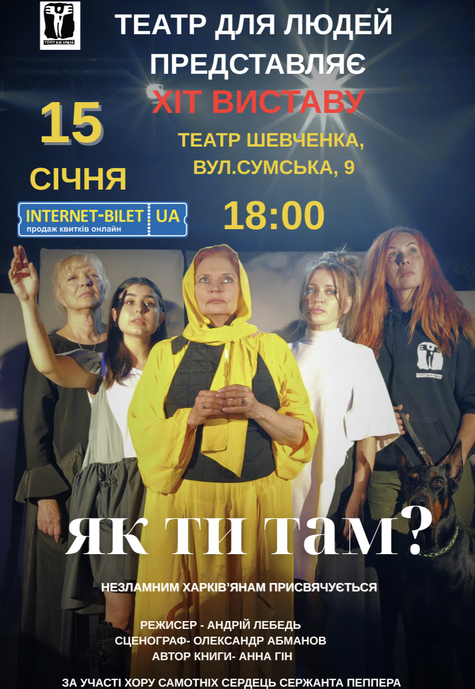 "Театр для людей". Спектакль "Как ты там?" состоится 15 января 2026, 18:00, четверг в ул. Сумская, 9. С помощью сервиса internet-bilet.ua, Вы сможете с легкостью забронировать, заказать и купить билеты на интересующий Вас концерт, спектакль, оперу, балет, мастер-классы, спортивные и детские мероприятия, оплатив их самым удобным для Вас способом: через интернет банковской картой VISA/MasterCard, наличными или курьером, если сделаете заказ билета c доставкой.