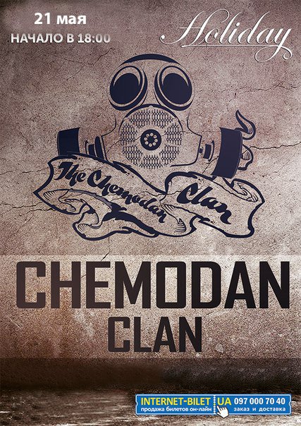 CHEMODAN CLAN состоится 21 мая 2016, 18:00, суббота в Holiday club. С помощью сервиса internet-bilet.ua, Вы сможете с легкостью забронировать, заказать и купить билеты на интересующий Вас концерт, спектакль, оперу, балет, мастер-классы, спортивные и детские мероприятия, оплатив их самым удобным для Вас способом: через интернет банковской картой VISA/MasterCard, наличными или курьером, если сделаете заказ билета c доставкой.