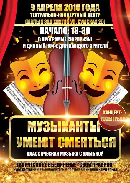 "Музыканты умеют смеяться" состоится 9 апреля 2016, 18:30, суббота в ТЕАТРАЛЬНО-КОНЦЕРТНЫЙ ЦЕНТР. С помощью сервиса internet-bilet.ua, Вы сможете с легкостью забронировать, заказать и купить билеты на интересующий Вас концерт, спектакль, оперу, балет, мастер-классы, спортивные и детские мероприятия, оплатив их самым удобным для Вас способом: через интернет банковской картой VISA/MasterCard, наличными или курьером, если сделаете заказ билета c доставкой.