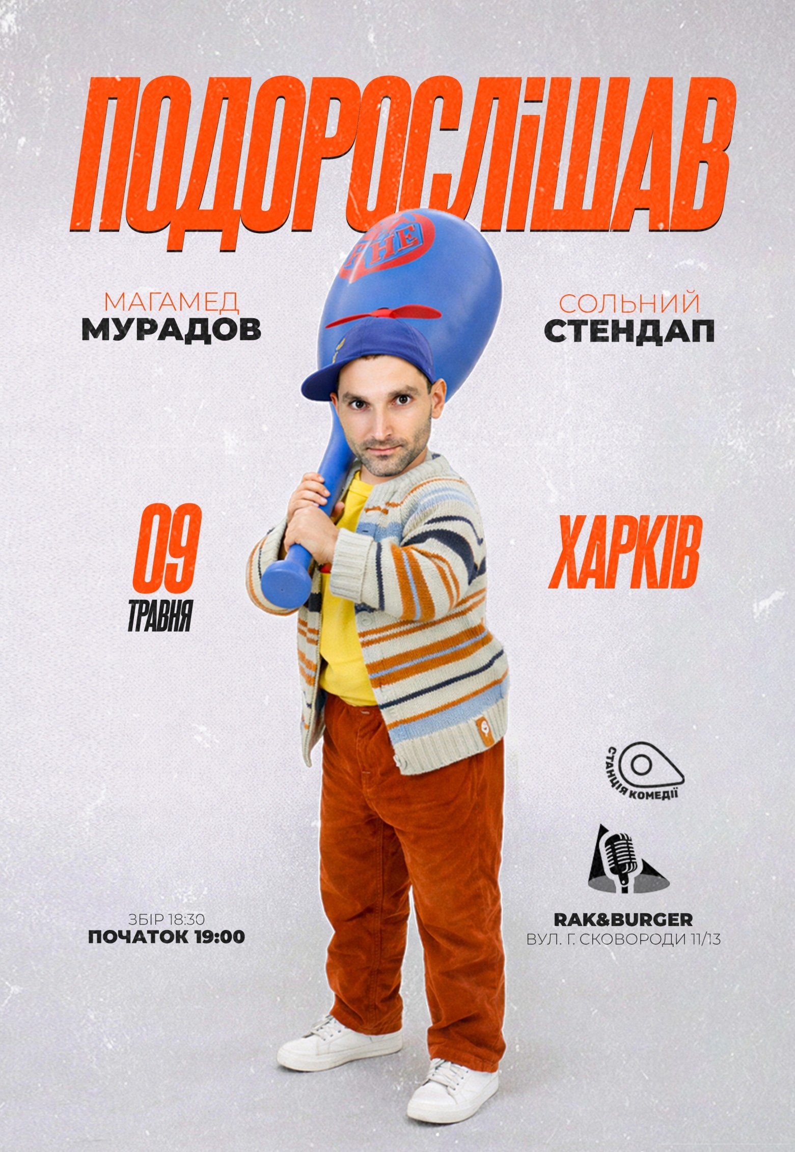Сольный stand up Магамеда Мурадова состоится 9 мая 2026, 19:00, суббота в Бар "Rak & Burger". С помощью сервиса internet-bilet.ua, Вы сможете с легкостью забронировать, заказать и купить билеты на интересующий Вас концерт, спектакль, оперу, балет, мастер-классы, спортивные и детские мероприятия, оплатив их самым удобным для Вас способом: через интернет банковской картой VISA/MasterCard, наличными или курьером, если сделаете заказ билета c доставкой.