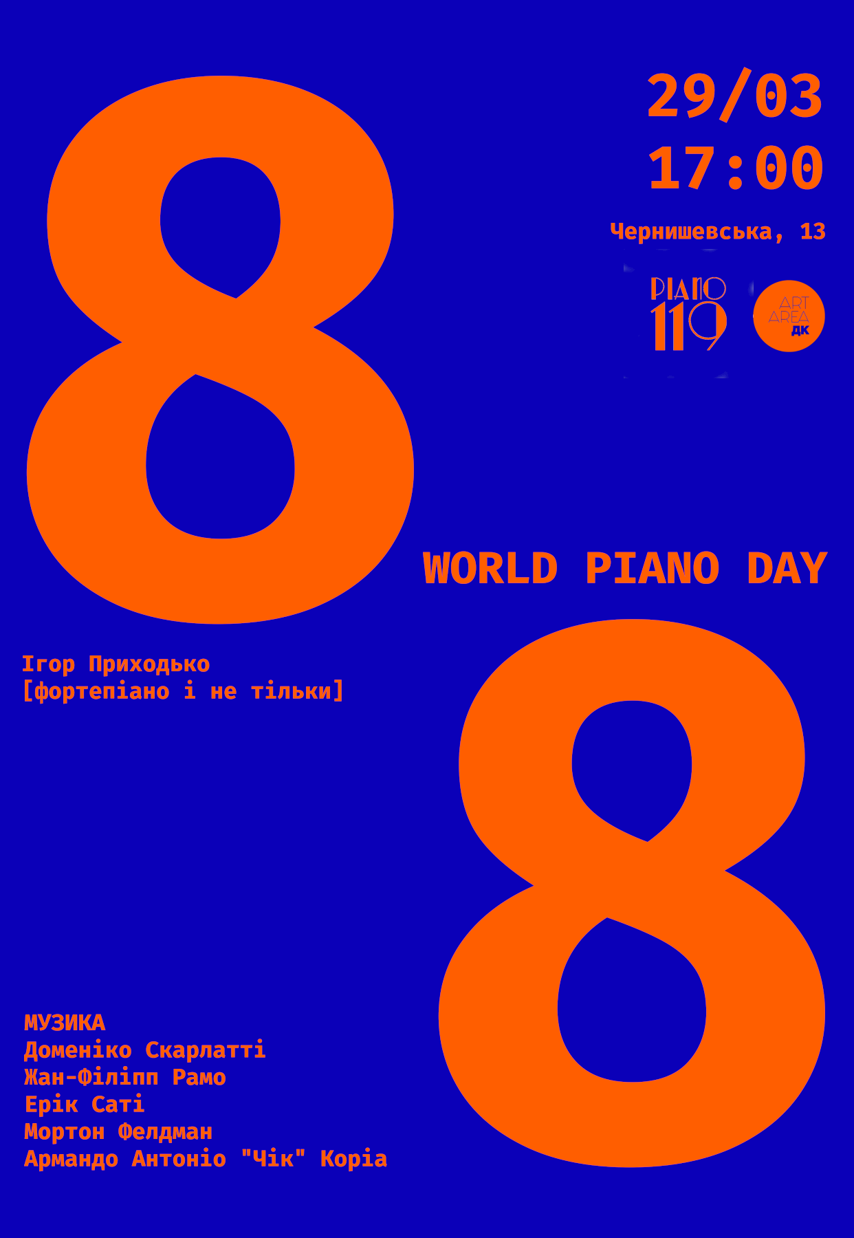 88 — Всемирный день фортепиано с Игорем Приходько состоится 29 марта 2026, 17:00, воскресенье в Art-Area ДК. С помощью сервиса internet-bilet.ua, Вы сможете с легкостью забронировать, заказать и купить билеты на интересующий Вас концерт, спектакль, оперу, балет, мастер-классы, спортивные и детские мероприятия, оплатив их самым удобным для Вас способом: через интернет банковской картой VISA/MasterCard, наличными или курьером, если сделаете заказ билета c доставкой.