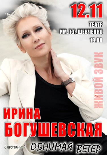 Середина ноября 2018 года в Харькове ознаменуется большим сольным концертом великолепной певицы, поэтессы и композитора Ирины Богушевской! 12 ноября в театре им.Т.Шевченко Ирина представит свою новую программу под названием «Обнимая ветер».