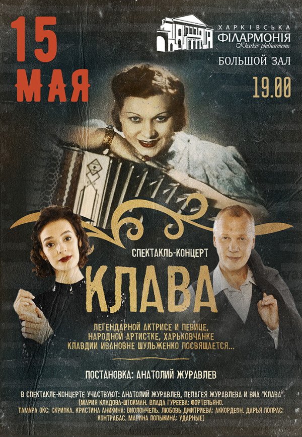 Клава состоится 15 мая 2019, 19:00, среда в Харьковская филармония (Большой зал). С помощью сервиса internet-bilet.ua, Вы сможете с легкостью забронировать, заказать и купить билеты на интересующий Вас концерт, спектакль, оперу, балет, мастер-классы, спортивные и детские мероприятия, оплатив их самым удобным для Вас способом: через интернет банковской картой VISA/MasterCard, наличными или курьером, если сделаете заказ билета c доставкой.