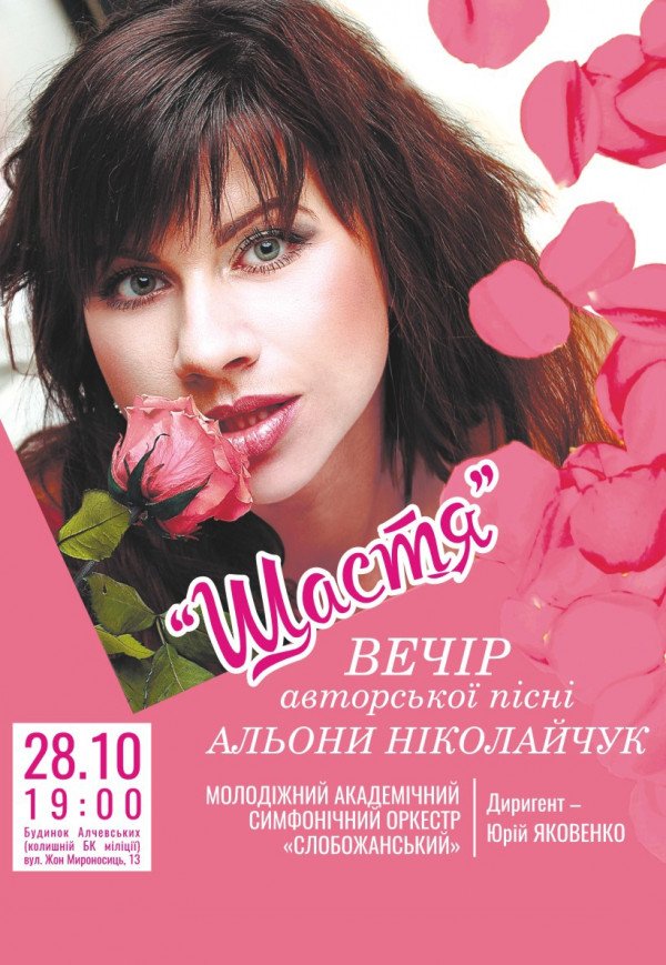 Впрочем, разве о песне расскажешь? Песню все-таки надо слушать и слышать. Поэтому приходите на концерт, с простым, но таким красноречивым названием «СЧАСТЬЕ» . Наслаждайтесь прекрасными песнями несравненной Алены Николайчук в сопровождении незабываемого молодежного академического симфонического оркестра «СЛОБОЖАНСКИЙ». И пусть этот прохладный осенний день станет для вас немного теплее и уютнее.