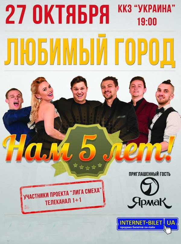 Любимый Город - Нам 5 лет состоится 27 октября 2016, 19:00, четверг в ККЗ "Україна". С помощью сервиса internet-bilet.ua, Вы сможете с легкостью забронировать, заказать и купить билеты на интересующий Вас концерт, спектакль, оперу, балет, мастер-классы, спортивные и детские мероприятия, оплатив их самым удобным для Вас способом: через интернет банковской картой VISA/MasterCard, наличными или курьером, если сделаете заказ билета c доставкой.