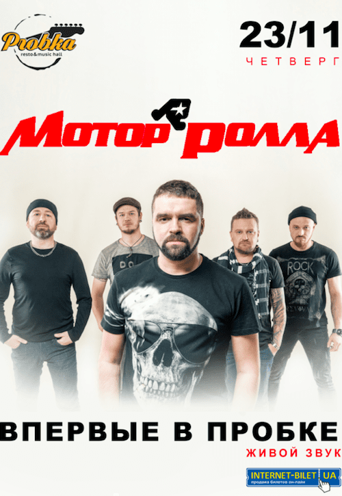 Концерт группы "МОТОР’РОЛЛА" состоится 23 ноября 2017 в "ПРОБКЕ Beer Hall" · Club С помощью сервиса internet-bilet.ua, Вы сможете с легкостью забронировать, заказать и купить билеты на интересующий Вас концерт, спектакль, оперу, балет, мастер-классы, спортивные и детские мероприятия, оплатив их самым удобным для Вас способом: через интернет банковской картой VISA/MasterCard, наличными или курьером, если сделаете заказ билета c доставкой