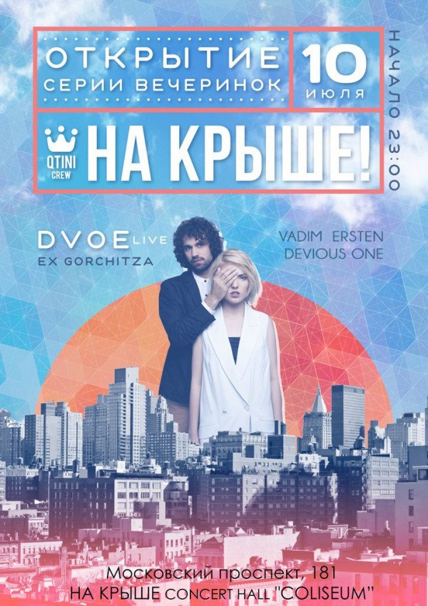 НА КРЫШЕ! состоится 10 июля 2015, 23:00, пятница в Концерт-холл «Колизей» . С помощью сервиса internet-bilet.ua, Вы сможете с легкостью забронировать, заказать и купить билеты на интересующий Вас концерт, спектакль, оперу, балет, мастер-классы, спортивные и детские мероприятия, оплатив их самым удобным для Вас способом: через интернет банковской картой VISA/MasterCard, наличными или курьером, если сделаете заказ билета c доставкой.
