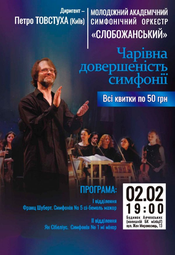 Молодежный академический симфонический оркестр «Слобожанский» благодарит всех своих поклонников за поддержку и, в честь юбилея творческой деятельности, дарит им в пятницу 2 февраля удивительный вечер симфоний. На концерте под названием «Неотразимое совершенство симфонии» прозвучат изящная и удивительно-совершенная пятая симфония Франца Шуберта и величественно-завораживающая первая симфония Яна Сибелиуса. Все это в виртуозном исполнении созвездия молодых талантливых музыкантов Молодёжного академического симфонического оркестра «СЛОБОЖАНСКИЙ», которым в этот вечер будет дирижировать признанный мастер дирижерского искусства Петр Товстуха. Стоимость билета чисто символическая – 50 грн. независимо от места.