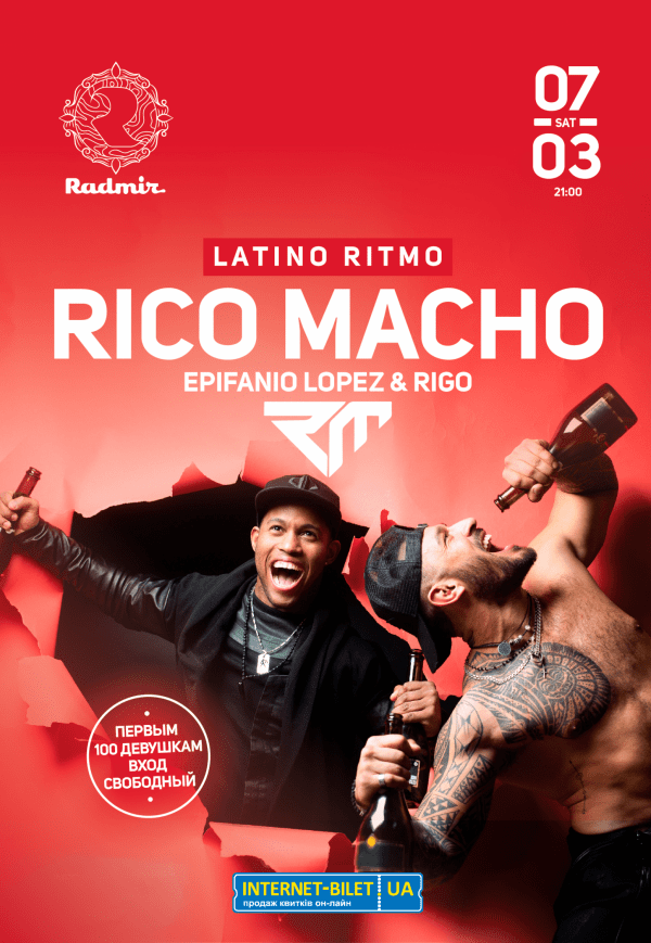 RICO MACHO состоится 7 марта 2020, 22:00, суббота в Radmir Club. С помощью сервиса internet-bilet.ua, Вы сможете с легкостью забронировать, заказать и купить билеты на интересующий Вас концерт, спектакль, оперу, балет, мастер-классы, спортивные и детские мероприятия, оплатив их самым удобным для Вас способом: через интернет банковской картой VISA/MasterCard, наличными или курьером, если сделаете заказ билета c доставкой.