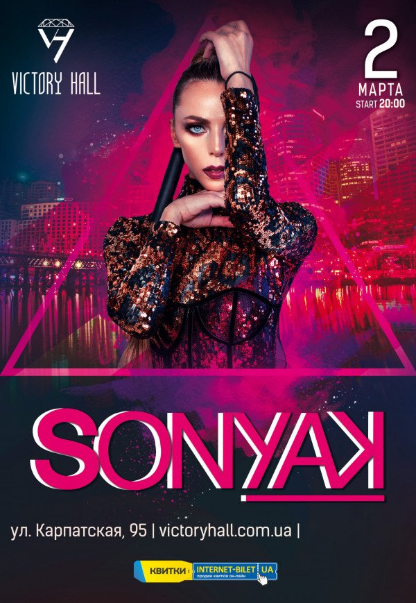 SONYA KAY состоится 2 марта 2019, 21:00, суббота в Victory Concert Hall. С помощью сервиса internet-bilet.ua, Вы сможете с легкостью забронировать, заказать и купить билеты на интересующий Вас концерт, спектакль, оперу, балет, мастер-классы, спортивные и детские мероприятия, оплатив их самым удобным для Вас способом: через интернет банковской картой VISA/MasterCard, наличными или курьером, если сделаете заказ билета c доставкой.