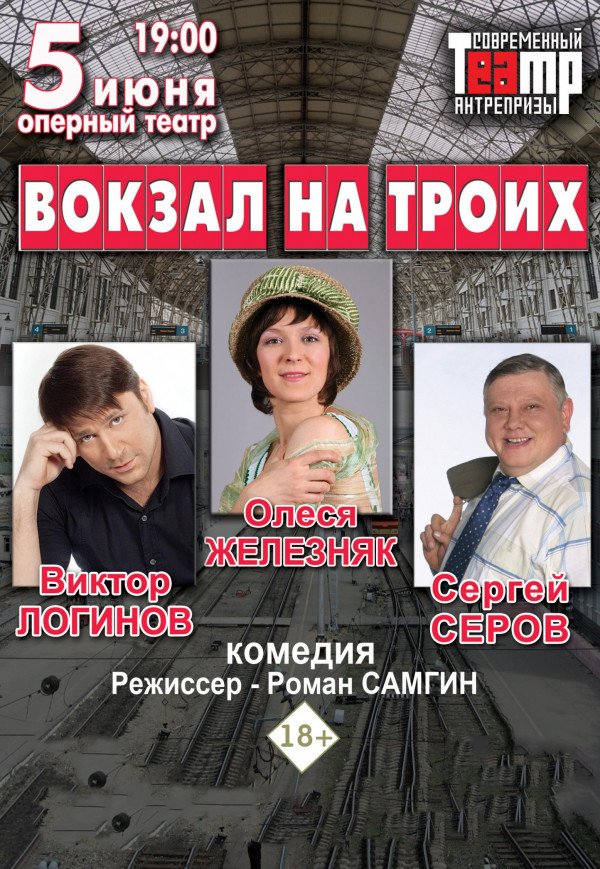 История о трех разных людях, вынужденных провести вместе несколько часов. «Вокзал для троих» – комедия  характеров. Посиделки бывшей заключенной, бывшей телезвезды и бармена заканчиваются совершенно не так, как могли бы завершиться в реальной жизни, и путь к этому «не так» наполнен слезами, смехом и открытиями из области природы человеческой натуры. В компании комедийных актеров Олеси Железняк и Сергея Серова, неожиданным выглядит появление чувственного Виктора Логинова, но трио весьма удачно – классический цирковой треугольник: «Рыжий клоун», «Белый клоун» и «Кукловод» - выглядит убедительно на театральной сцене. Режиссер – Роман Самгин, ученик Марка Захарова, обладатель премии за лучшую режиссуру и премии за лучший спектакль на театральном фестивале в Брно.