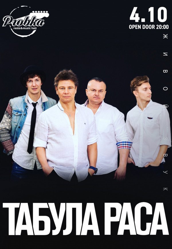 ТАБУЛА РАСА состоится 4 октября 2018, 20:00, четверг в resto&music hall PROBKA. С помощью сервиса internet-bilet.ua, Вы сможете с легкостью забронировать, заказать и купить билеты на интересующий Вас концерт, спектакль, оперу, балет, мастер-классы, спортивные и детские мероприятия, оплатив их самым удобным для Вас способом: через интернет банковской картой VISA/MasterCard, наличными или курьером, если сделаете заказ билета c доставкой.