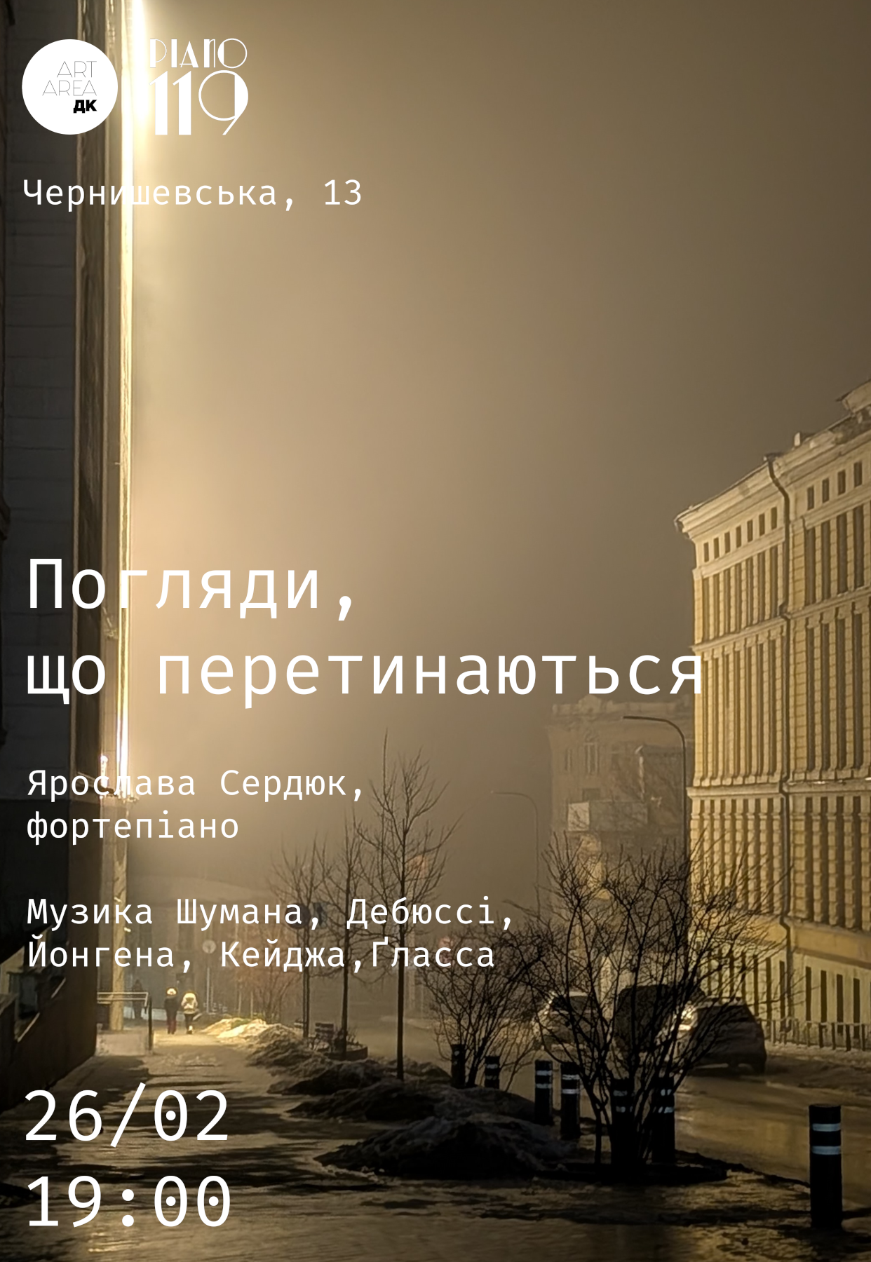 "Погляди, що перетинаються". Ярослава Сердюк (фортепиано) состоится 26 февраля 2026, 19:00, четверг в Art-Area ДК. С помощью сервиса internet-bilet.ua, Вы сможете с легкостью забронировать, заказать и купить билеты на интересующий Вас концерт, спектакль, оперу, балет, мастер-классы, спортивные и детские мероприятия, оплатив их самым удобным для Вас способом: через интернет банковской картой VISA/MasterCard, наличными или курьером, если сделаете заказ билета c доставкой.