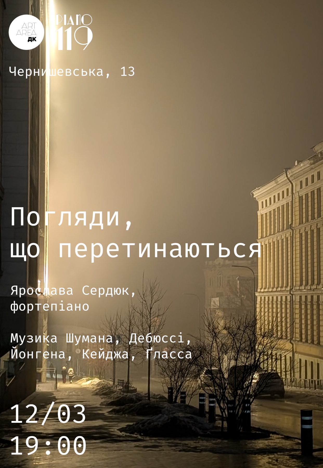 "Погляди, що перетинаються". Ярослава Сердюк (фортепиано) состоится 12 марта 2026, 19:00, четверг в Art-Area ДК. С помощью сервиса internet-bilet.ua, Вы сможете с легкостью забронировать, заказать и купить билеты на интересующий Вас концерт, спектакль, оперу, балет, мастер-классы, спортивные и детские мероприятия, оплатив их самым удобным для Вас способом: через интернет банковской картой VISA/MasterCard, наличными или курьером, если сделаете заказ билета c доставкой.