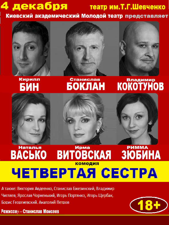 Четвертая сестра відбудеться 4 грудня 2016, 19:00, неділя в Харківський театр ім. Т.Г. Шевченка. За допомогою сервісу internet-bilet.ua, Ви зможете з легкістю забронювати, замовити та купити квитки на концерт, спектакль, оперу, балет, майстер-класи, спортивні та дитячі заходи, що Вас цікавлять, оплативши їх найбільш зручним для Вас способом: через інтернет банківською карткою VISA/MasterCard, готівкою або кур'єром, якщо зробите замовлення квитка з доставкою.