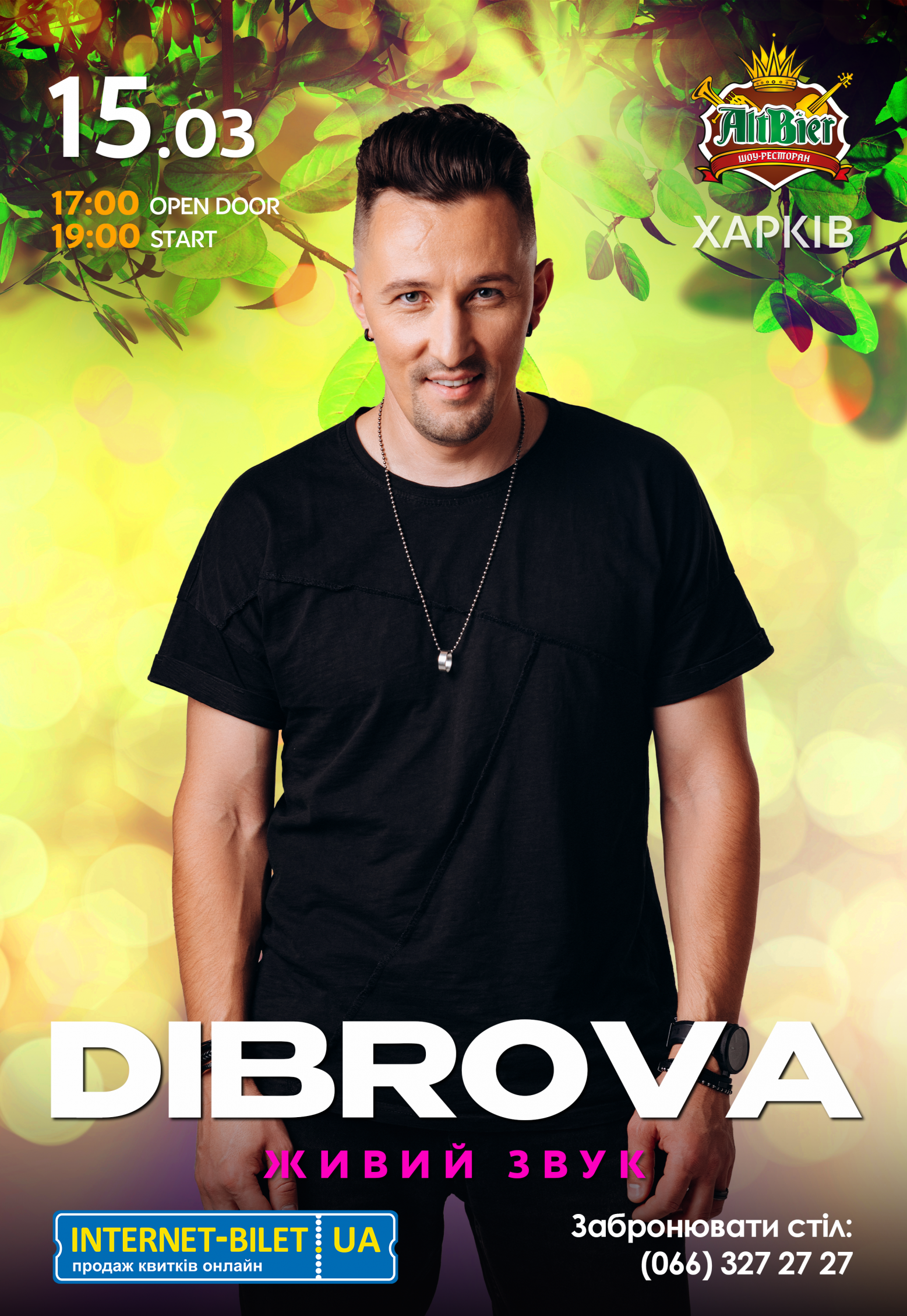 DIBROVA відбудеться 15 березня 2026, 19:00, неділя в Шоу-ресторан «AltBier». За допомогою сервісу internet-bilet.ua, Ви зможете з легкістю забронювати, замовити та купити квитки на концерт, спектакль, оперу, балет, майстер-класи, спортивні та дитячі заходи, що Вас цікавлять, оплативши їх найбільш зручним для Вас способом: через інтернет банківською карткою VISA/MasterCard, готівкою або кур'єром, якщо зробите замовлення квитка з доставкою.