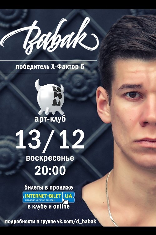 BABAK відбудеться 13 грудня 2015, 20:00, неділя в Клуб "Корова". За допомогою сервісу internet-bilet.ua, Ви зможете з легкістю забронювати, замовити та купити квитки на концерт, спектакль, оперу, балет, майстер-класи, спортивні та дитячі заходи, що Вас цікавлять, оплативши їх найбільш зручним для Вас способом: через інтернет банківською карткою VISA/MasterCard, готівкою або кур'єром, якщо зробите замовлення квитка з доставкою.