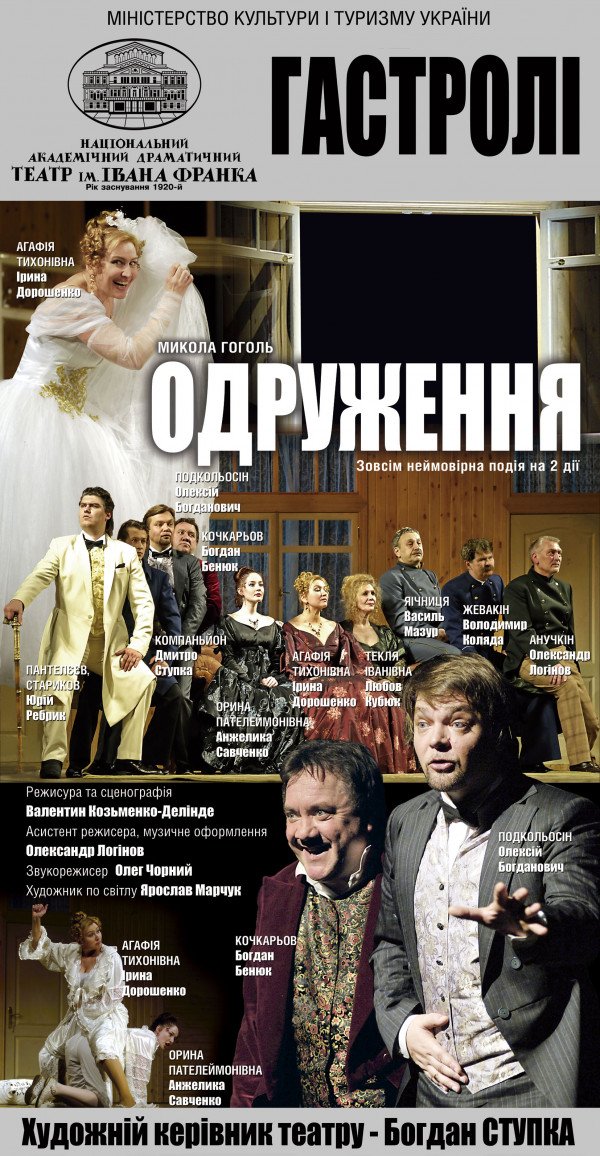 Одруження відбудеться 14 листопада 2012, 19:00, середа в Харківський театр ім. Т.Г. Шевченка. За допомогою сервісу internet-bilet.ua, Ви зможете з легкістю забронювати, замовити та купити квитки на концерт, спектакль, оперу, балет, майстер-класи, спортивні та дитячі заходи, що Вас цікавлять, оплативши їх найбільш зручним для Вас способом: через інтернет банківською карткою VISA/MasterCard, готівкою або кур'єром, якщо зробите замовлення квитка з доставкою.