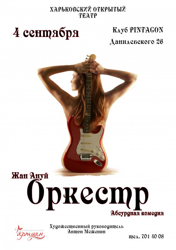 Жан Ануй "Оркестр" - комедия, от которой захочется плакать, трагедия, над которой захочется посмеяться…. 4 СЕНТЯБРЯ - маленькая жизнь в одном действии на сцене клуба "Пинтагон".